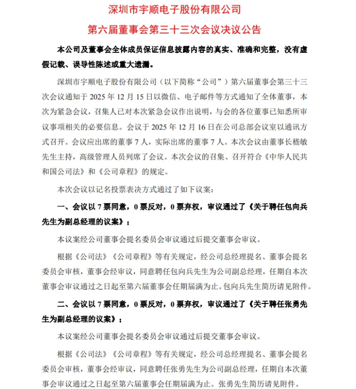 12月17日晚间,*ST宇顺连发数份公告,在这数份公告中夹杂着《第六届董事会第三十三次会议决议公告》。在这份公告中,*ST宇顺以7票全数通过了聘任包向兵、张勇出任副总经理的议案,而其中张勇的从业经历引发关注。